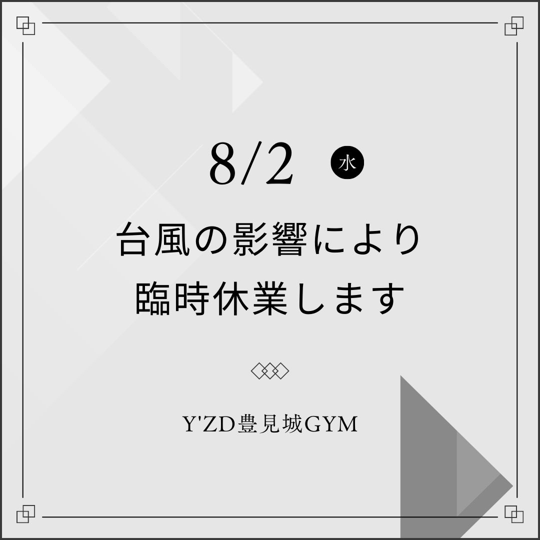 2023年8月 4日|台風6号接近に伴う臨時休業のお知らせ 会員様各位 台風6号が沖縄本島地方に最接近し、今夜から暴風域に入るため、本日の営業時間を20時(最終受付19時)とさせていただきます。 明日の営業については、警報及び状況を確認し、9時ごろまでにホームページの「お知らせ」続きを読む >> 2023年8月3日(木)|通常営業へ再開します 台風6号が過ぎ去り、本日8月3日(木)より通常営業へと再開します。 まだまだ足下は悪いですが、ジムへお越しの際は十分にご注意ください。 また、台風6号が再上陸する可能性も予想されているため、会員様におかれましても台風情報続きを読む >> 2023年8月2日(水)|臨時休業のお知らせ 台風6号の影響により、豊見城市全域に停電や大雨土砂災害の被害が発生していることから、本日8月2日(水)も臨時休業とします。 2023年8月1日|台風6号接近に伴う臨時休業のお知らせ 臨時休業のお知らせ 沖縄本島地方に台風6号が接近し、暴風警報が発令されました。 それに伴い、本日8月1日(火)は臨時休業とさせていただきます。 会員の皆様も安全確保し、注意してお過ごしください。 2023年7月31日(月)PM18:45|時短営業について 本日7/31(月)は台風接近に伴い、21時までの営業となります。 (21時過ぎから大雨の予報が出たため、時短営業となります) 予めご容赦ください。 会員様におかれましても、台風対策を怠らずお過ごしください。 2023年7月31日am10:30現在|台風6号接近に伴う営業時間について 沖縄本島地方に台風6号が接近しております。今夜には暴風域に入る見込みのため、状況に応じてジムの営業時間を短縮させていただく場合があります。 今後の情報はSNS、ホームページの「お知らせ」にて随時更新します。 なお、徐々に続きを読む >>