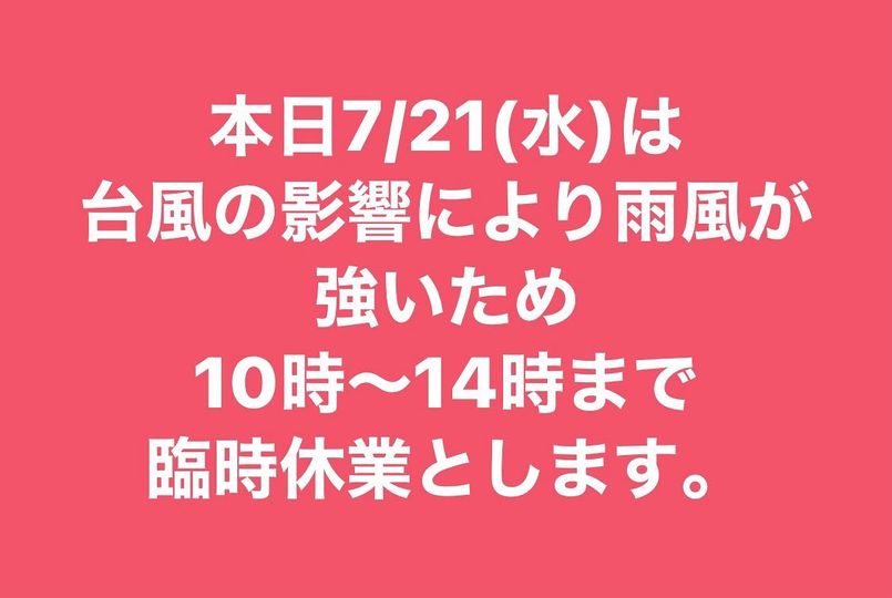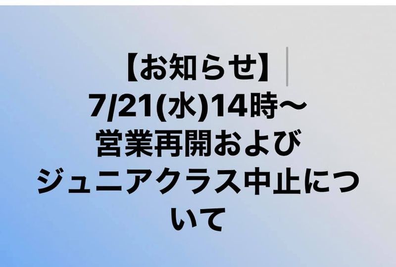 2021年8月休館・旧盆スケジュール 会員様各位 会員様宛のメールにもお知らせしてますが、8月の休館案内と旧盆案内です。 お間違えのないようご注意ください。 ———————&続きを読む >> 2021年7月22日(木)・7月23日(金) 休館日の再々案内 会員様各位 いつも豊見城ジムをご利用いただき、誠にありがとうございます。 さて、先月から7月の休館日をお知らせしておりましたが、再々案内します。 本日7/22(木)及び明日7/23(金)は休館日となってます。 今年度の7続きを読む >> 7/21(水)営業再開とジュニアクラスお休みについて 会員様各位 本日の営業は14時から再開します。 しかしながら、まだまだ天候が悪く足元もよくない状況が続くと思われます。 ご来館の際はくれぐれもご注意ください。 それに伴い、子どもたちの安全面を考慮するとともに、県立小中学続きを読む >> 台風6号接近による臨時休業について 本日7/21(水)は台風の影響により雨風が強いため、10時〜14時まで臨時休業いたします。 7月21日(水) 臨時休業 10:00〜14:00 オープン予定 14:00〜 なお、午後の営業も台風の進路や状況により、変更す続きを読む >> 台風6号接近に伴う時短営業について(2021年7月20日(水)18:20現在) 台風6号の勢力が高まり、これから明日にかけて暴風になる恐れがあるため、本日は時短営業となり21時(最終受付20時)までとなります。 <時短営業> 本日 7月20日(火)21時まで(最終受付20時) 会員の皆さまも台風対策続きを読む >>